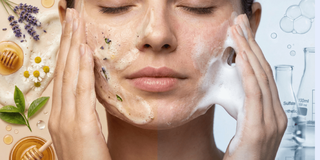الفرق الجوهري يكمن في اللطف والعمق؛ فالغسولات الكيميائية غالباً ما تعتمد على السلفات لخلق رغوة كثيفة تجفف البشرة، بينما يستخدم الغسول الطبيعي مستخلصات نباتية تنظف المسام بعمق مع الحفاظ على الزيوت الطبيعية للبشرة.